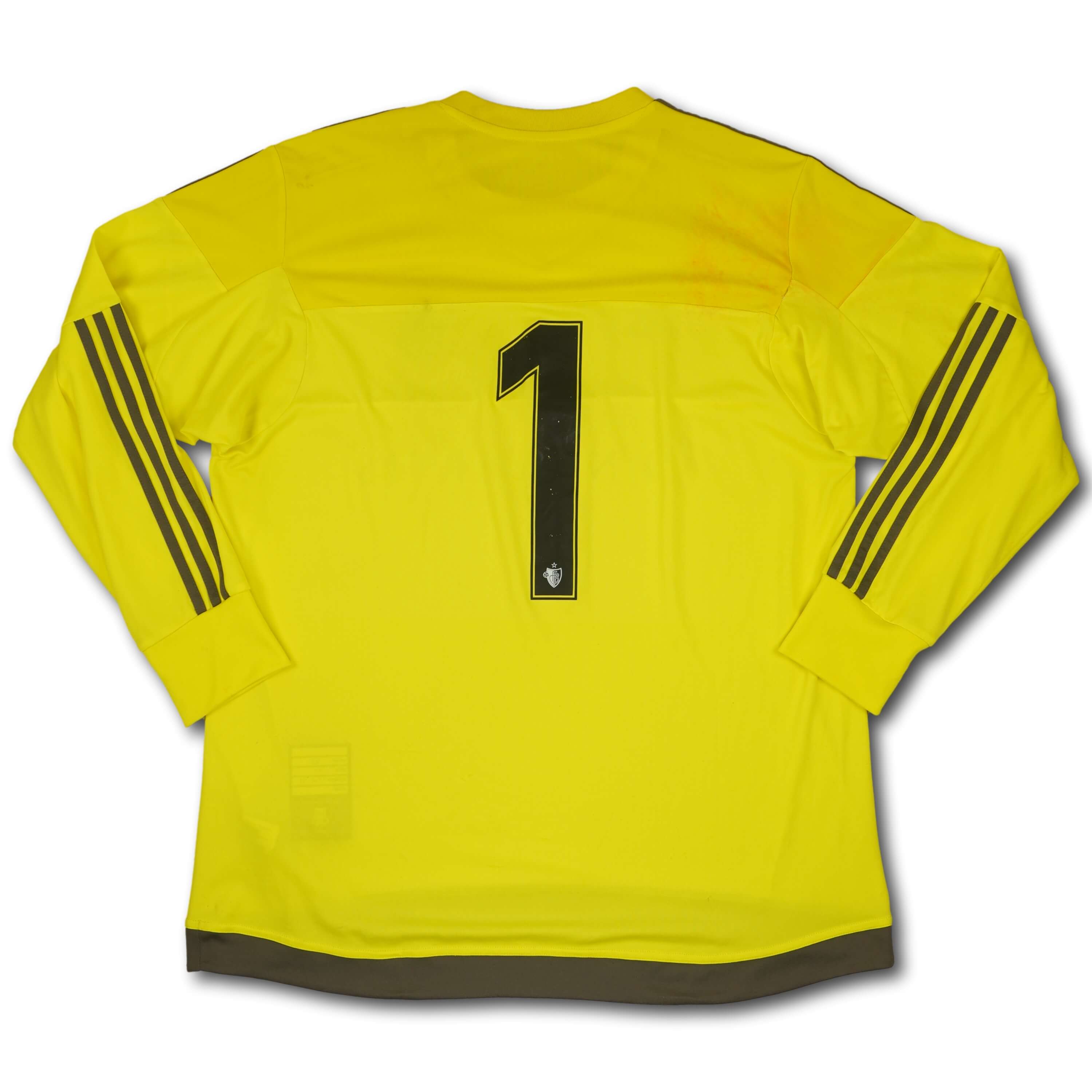 Vereinsemblem ist leider sichtbar beschädigt. Hat auch viele Fussel und am Rücken eine sichtbare Verfärbung.