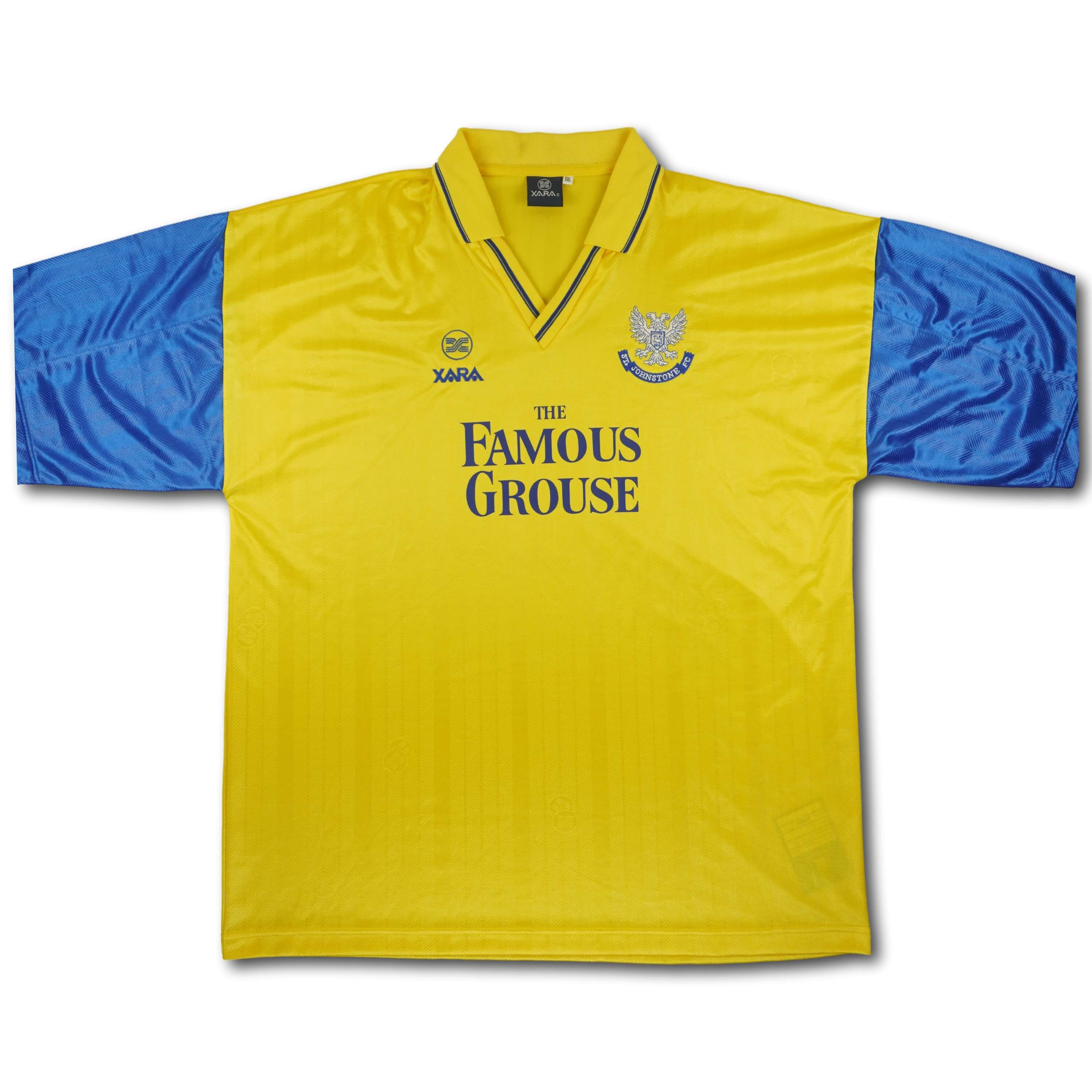 Seltenes Auswärtstrikot des schottischen Premiership Vereins St. Johnstone aus der Saison 1997-98. Wie es sich für ein schottisches Team gehört, war der Verein damals von der Whiskeymarke "The Famous Grouse" gesponsort.