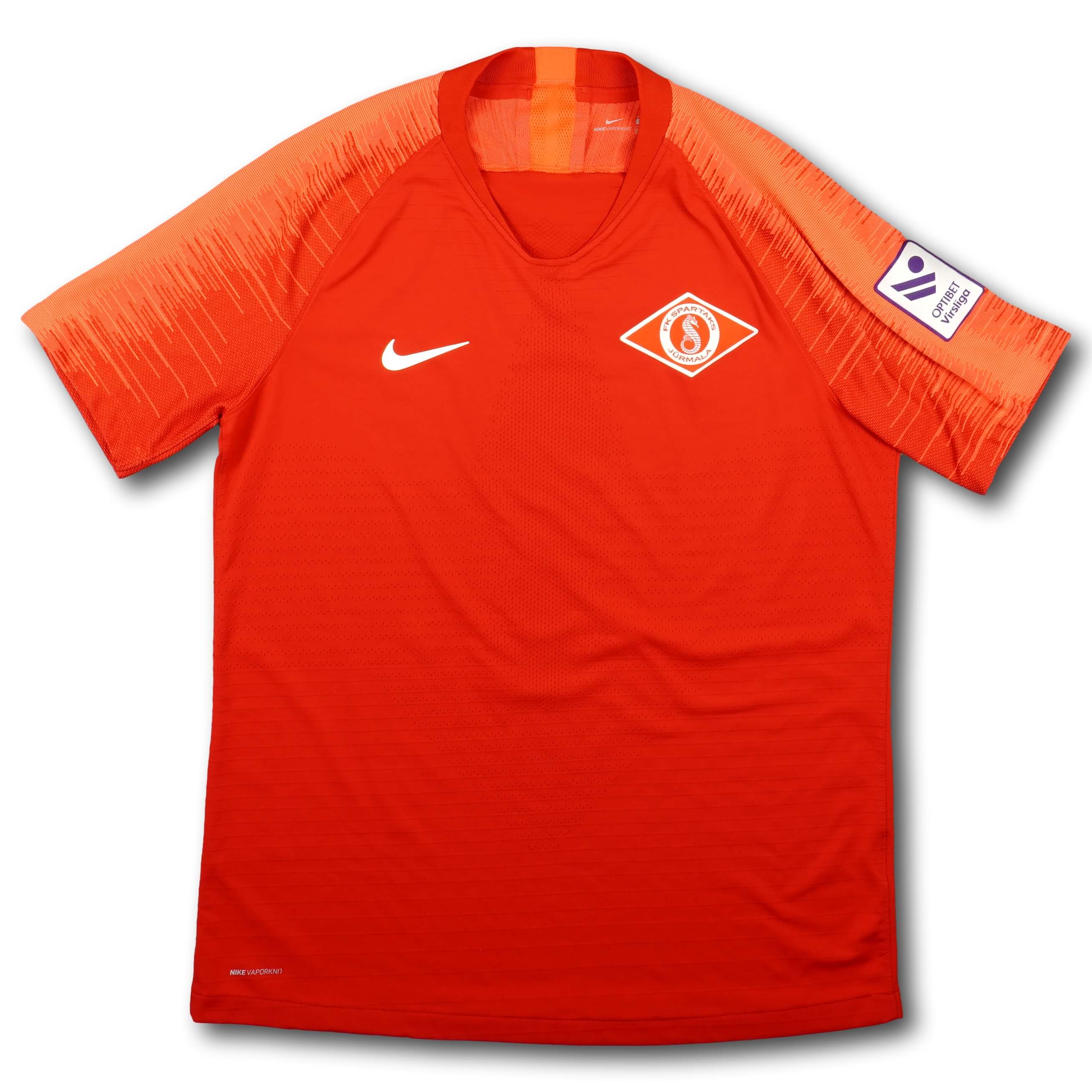 2019 Player Version Heimtrikot des lettischen Vereins Spartaks Jūrmala mit Nameset des lettischen Innenverteidigers Vitalijs Smirnovs. Das Trikot wurde gemäss den Spezifikationen eines Spielertrikots hergestellt: Nike Vaporknit Trikottechnologie anstatt Dri-Fit, mit Hitze aufgepresstes Clubemblem und Herstellerlogo sowie etwas atmungsaktiveres und enger geschnittenes Material.
