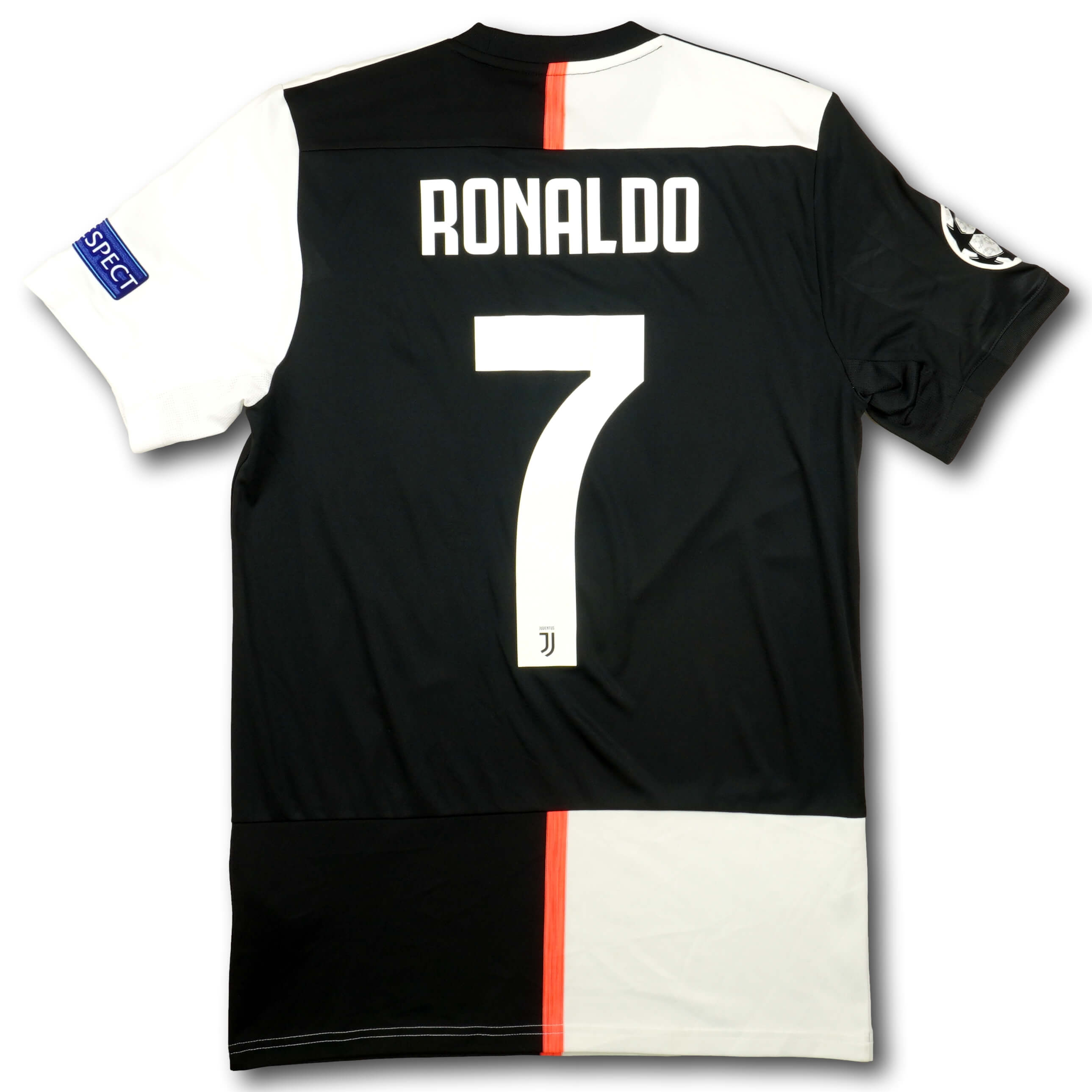 Juventus Heimtrikot aus der Meistersaison 2019-20 mit Nameset von Cristiano Ronaldo und Uefa Champions League Patches auf dem rechten und linken Ärmel. Das Trikot ist in hervorragendem Zustand.